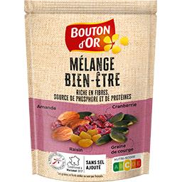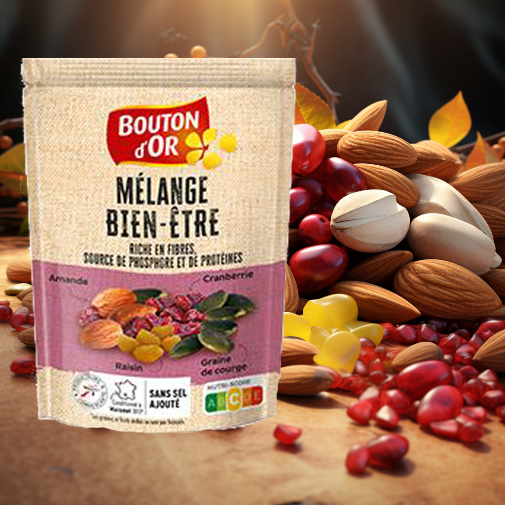 Le Mélange Bien-être Bouton d'Or est une combinaison exquise de fruits secs, de graines, et de noix soigneusement sélectionnés pour une expérience gourmande et nutritive.