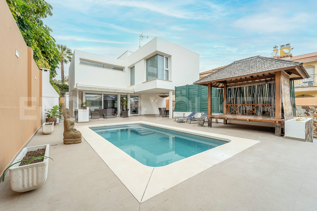 Beautiful 5-bedrooms, 5-bathroom minimalist villa designed and built using top quality materials by the current owners. The house is located in Playamar, one of the most exclusive residential areas in Torremolinos. The beach is about an 8-minute walk away while shops, bars, and restaurants are also easily accessible by foot. The property is fully furnished and has spacious and bright interiors. Particularly noteworthy is the double-height living room with access to an internal terrace, and a large deck facing the pool with a barbecue area. The underground garage is very spacious and has space for up to 4 cars and a multipurpose area.
